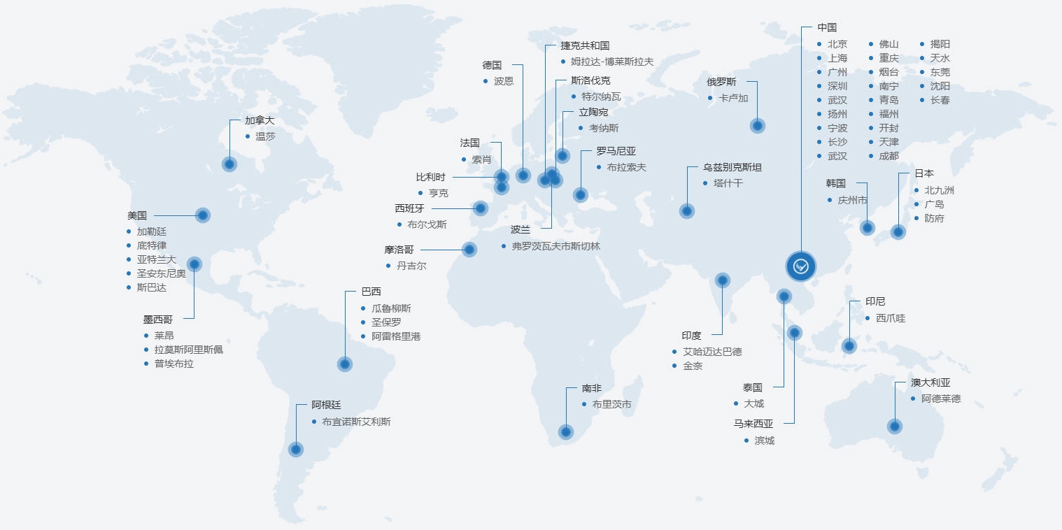 在北美、南美、欧、亚、非五大洲设立服务中心,提供7×24小时现场与在线支持